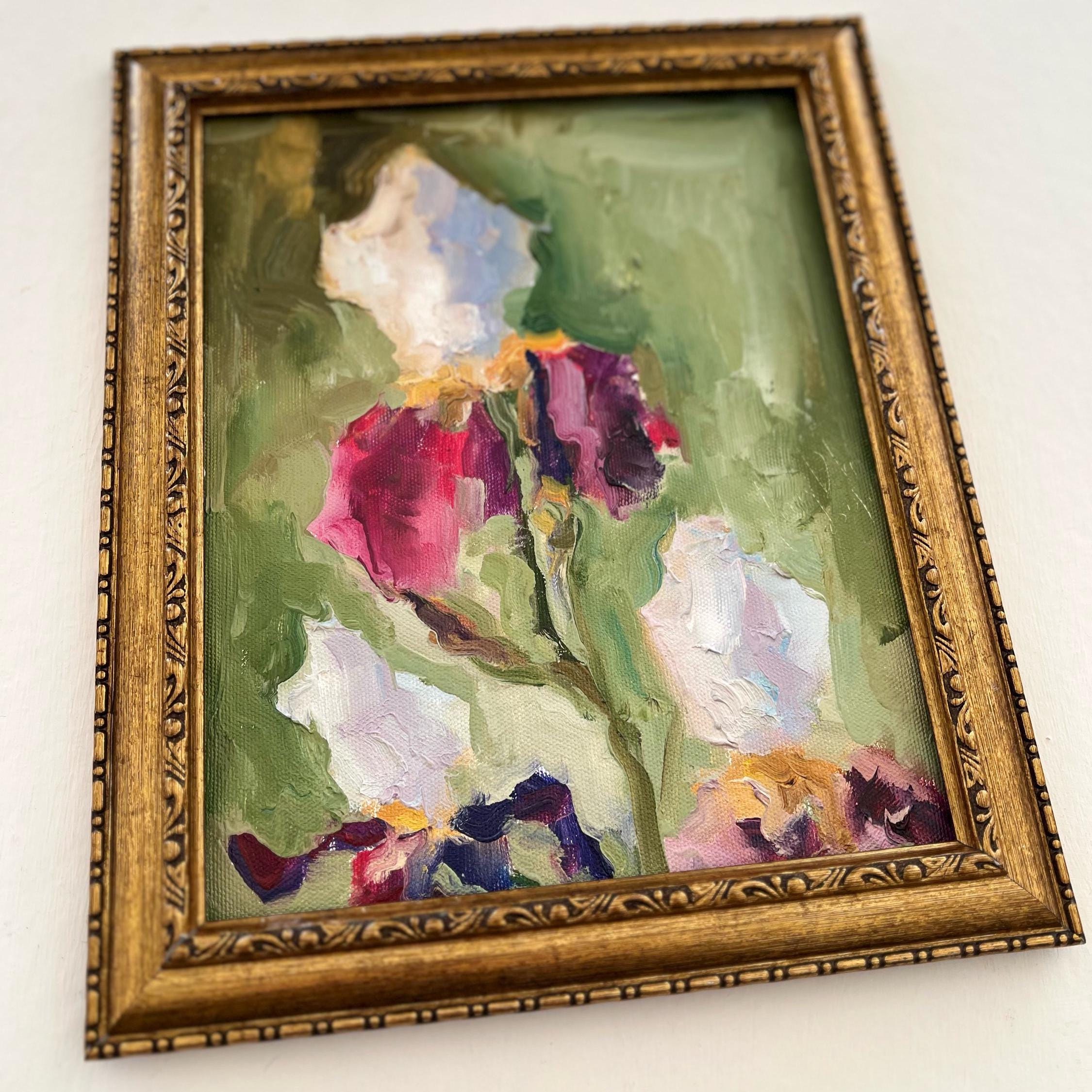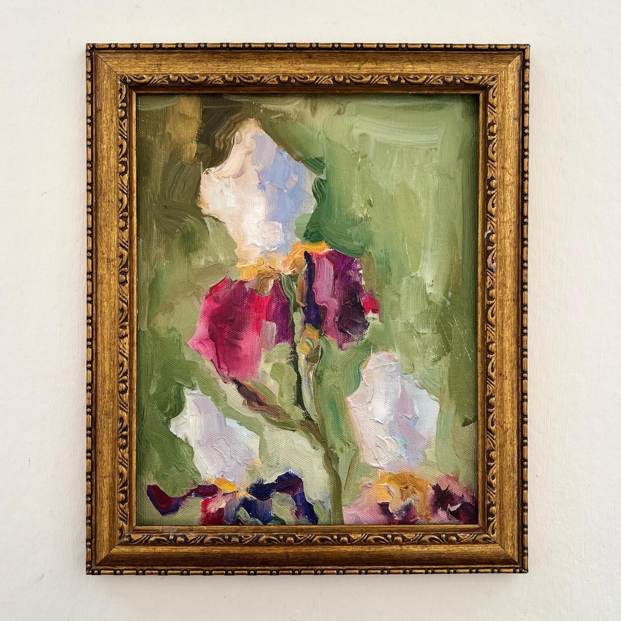 Original Iris Impasto Oil Painting: Floral Still Life, Framed Canvas Art (8x10)