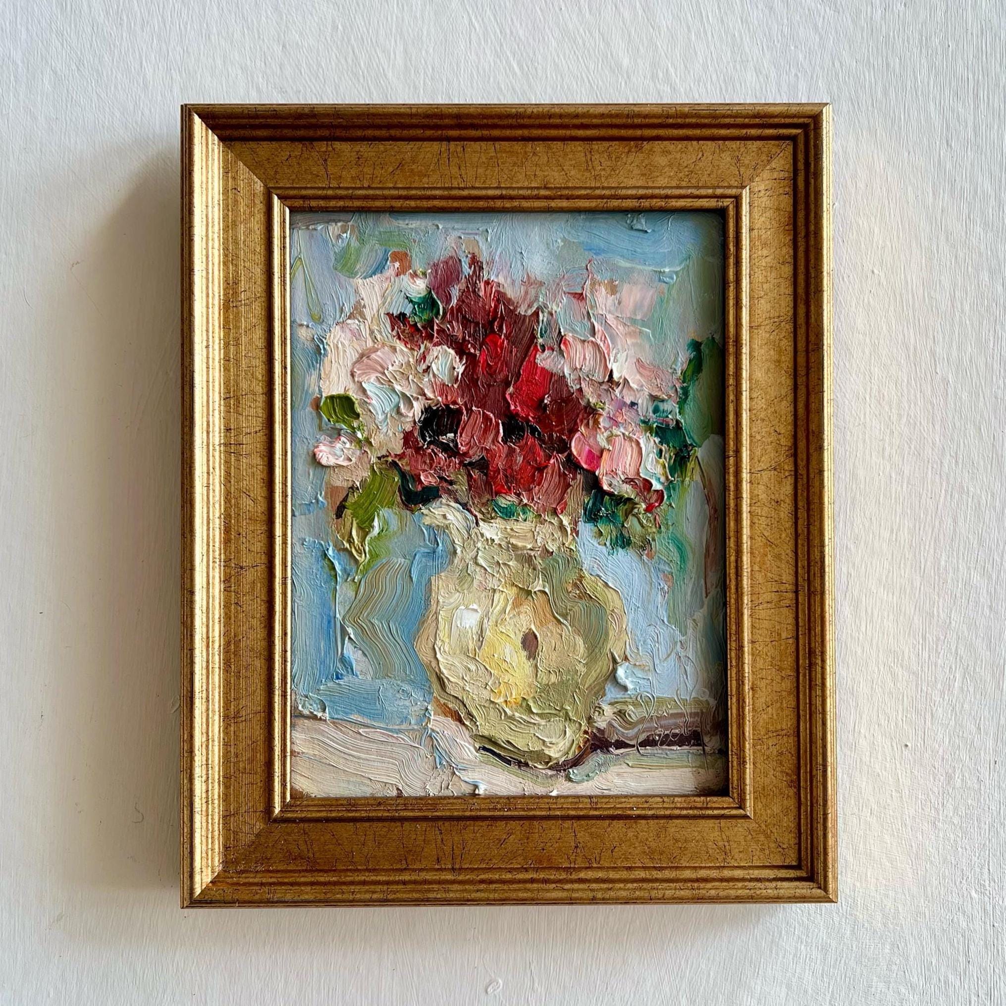 Pink and Red Flowers, Original Art, Peonies Impasto Painting, Floral Semi Abstract Painting Impasto Artwork 6 by 8 by DiyaSanat