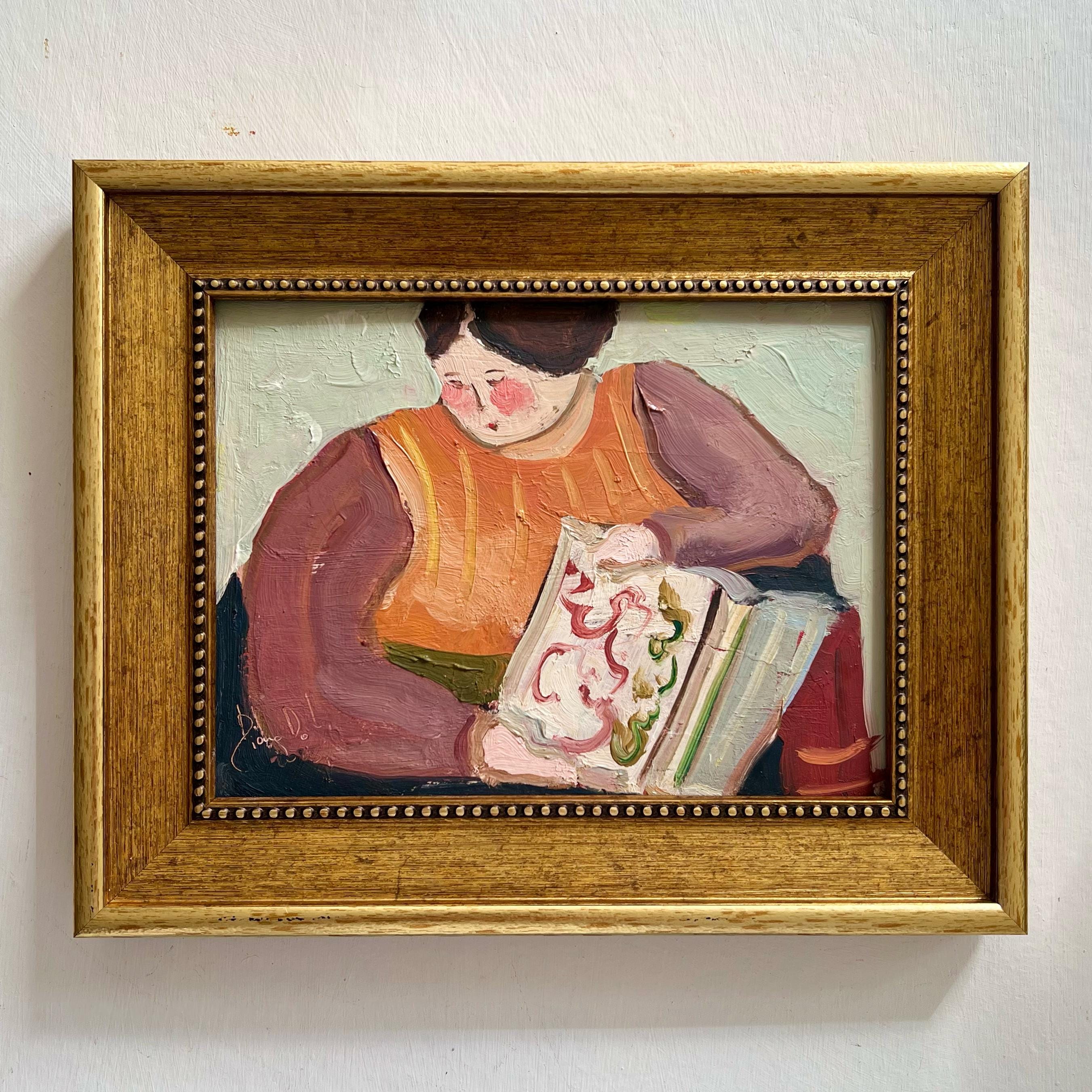 Original Oil Painting: Woman with Book, Semi-Abstract Portrait