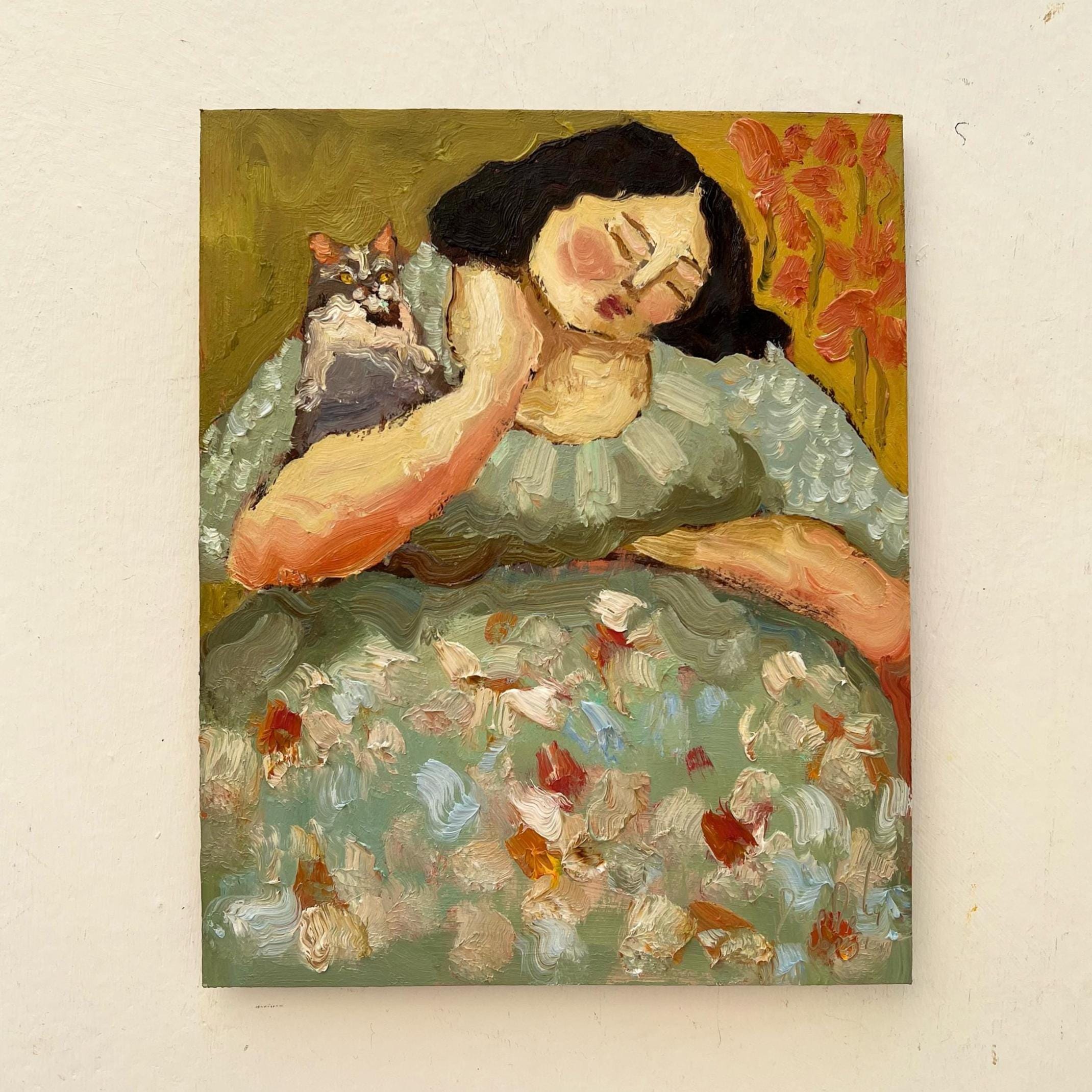 This original oil painting depicts a peaceful, dreamy moment — a sleeping girl resting her head gently on her hand, with a quiet cat nestled beside her. The scene evokes warmth, calm, and a sense of gentle companionship.