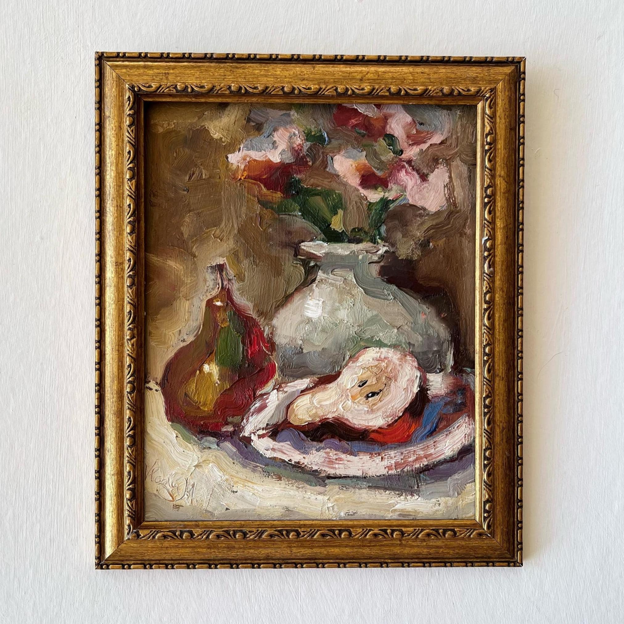This original oil painting is an intimate still life featuring a ripe pear, a simple vase with flowers, and soft everyday objects arranged in a quiet, cozy composition. Expressive brushstrokes and warm, earthy tones create a sense of intimacy, comfort, and timeless domestic beauty.