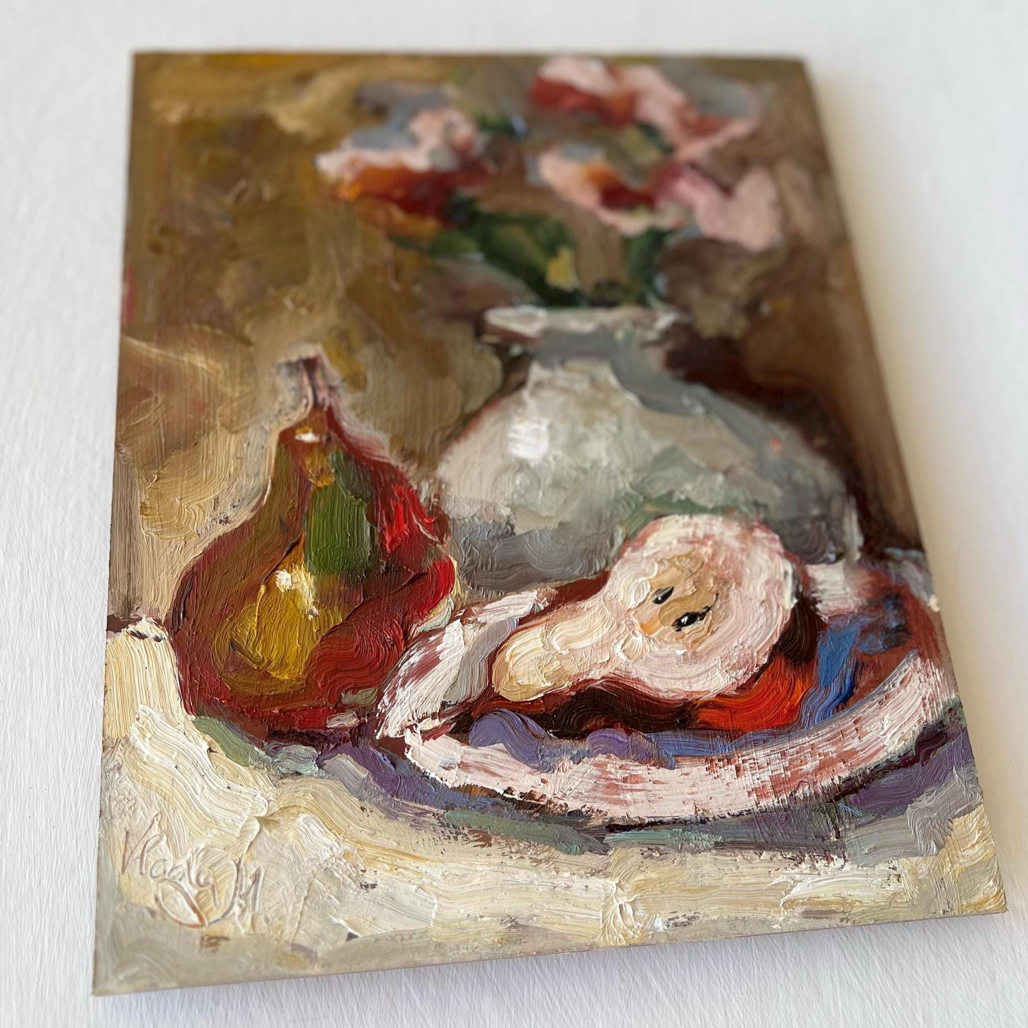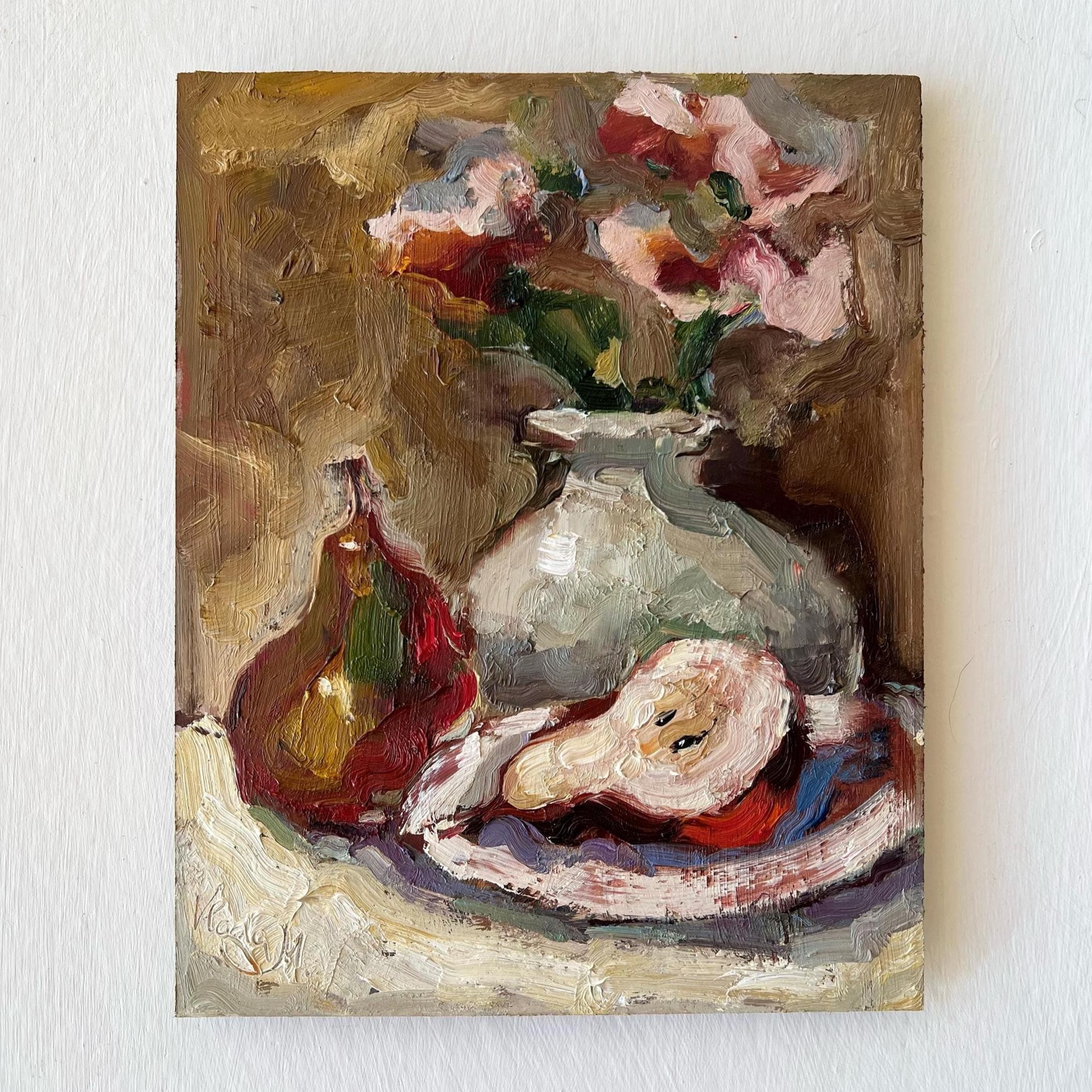 Still Life with Pear and Flowers – Original Oil Painting 8x10 on Cardboard, Cozy Kitchen Wall Art