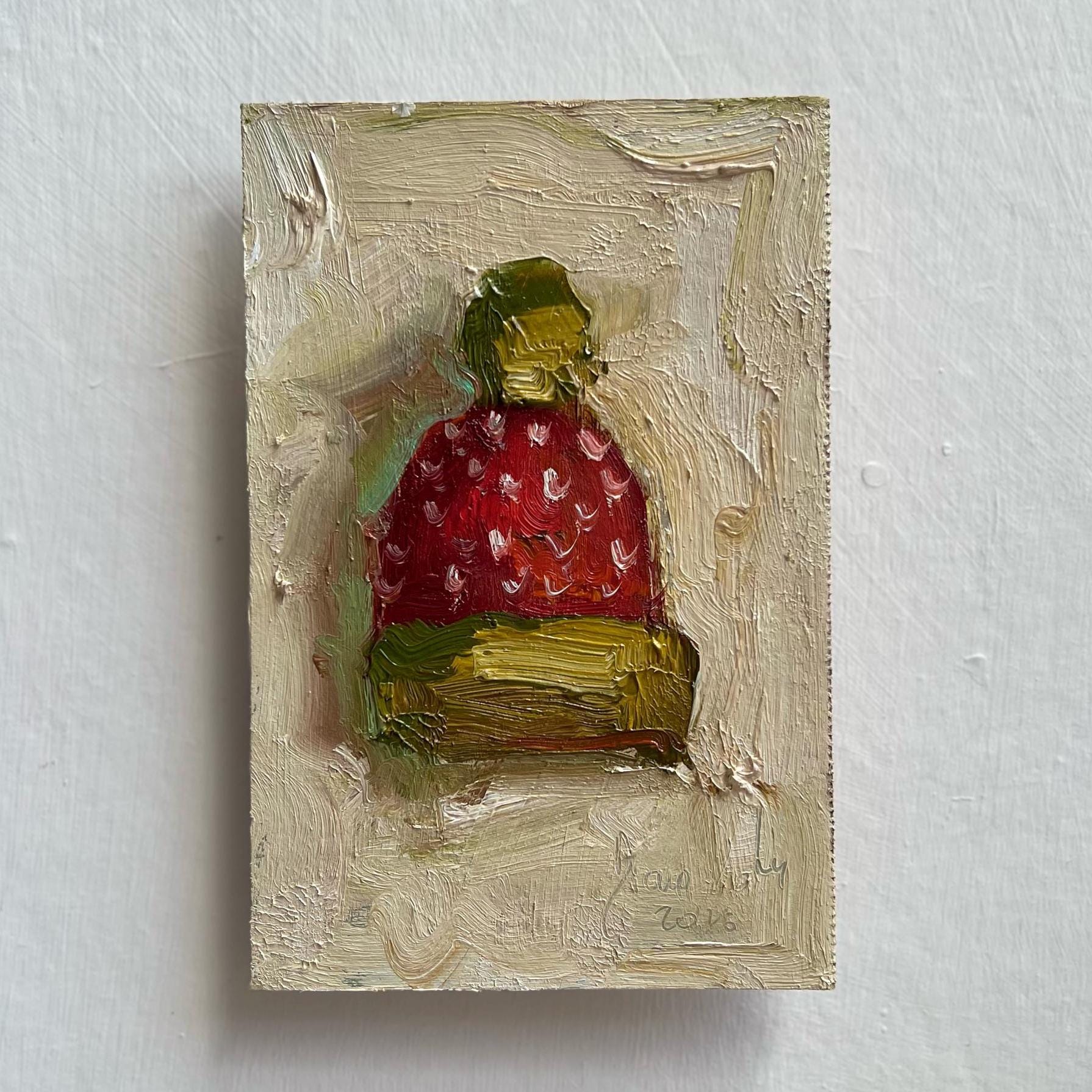 Red Knit Hat – Mini Original Oil Painting 6x4, Small Textured Art