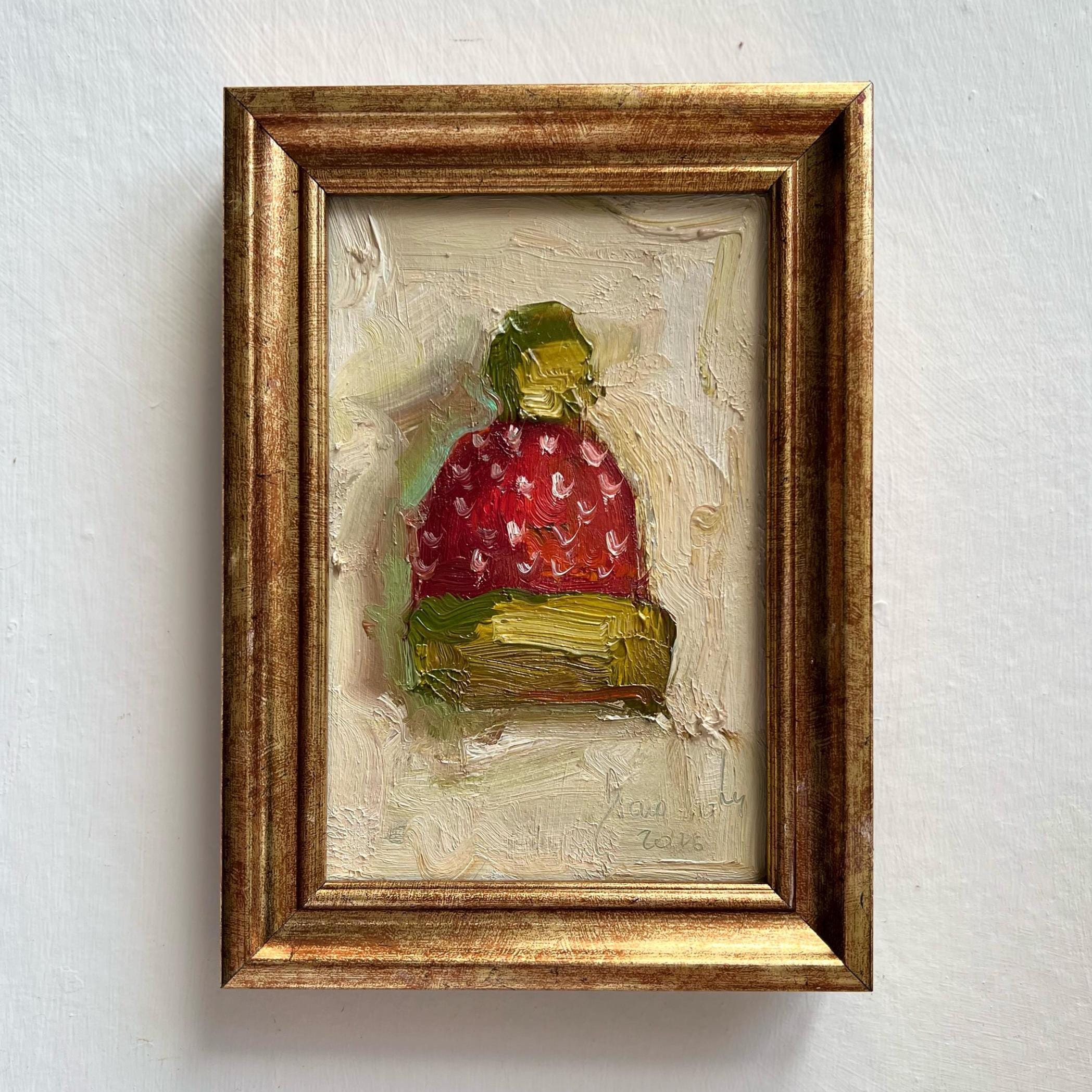 This mini original oil painting features a cozy red knit hat captured with expressive, textured brushstrokes. The simple composition and warm, neutral background highlight the tactile quality of the paint and the quiet charm of everyday objects.